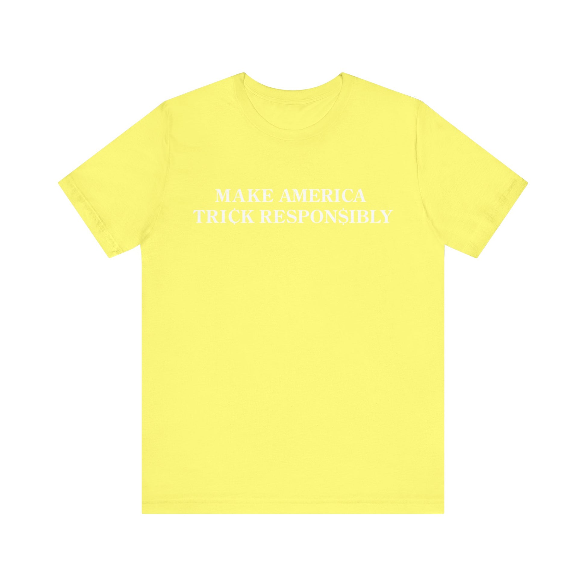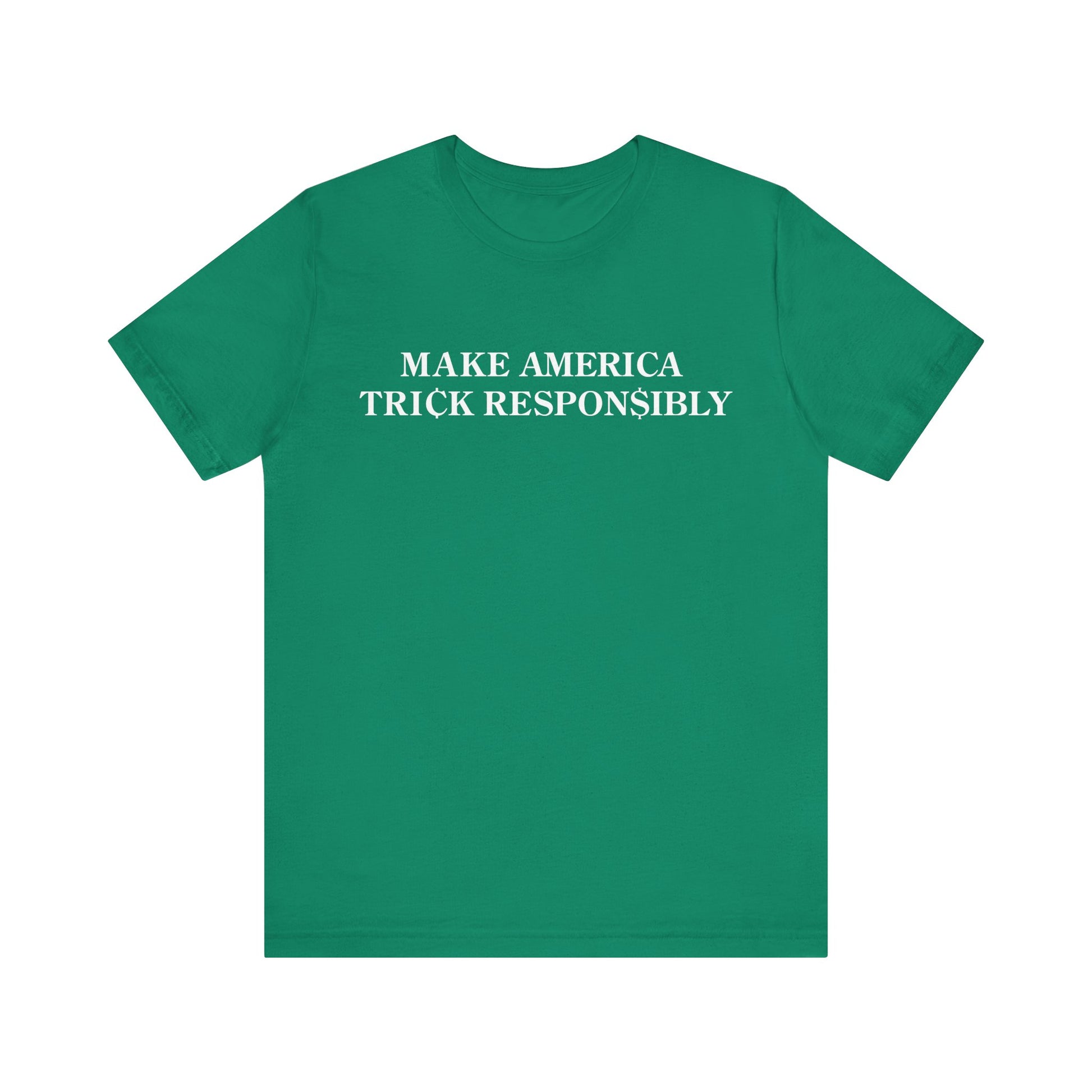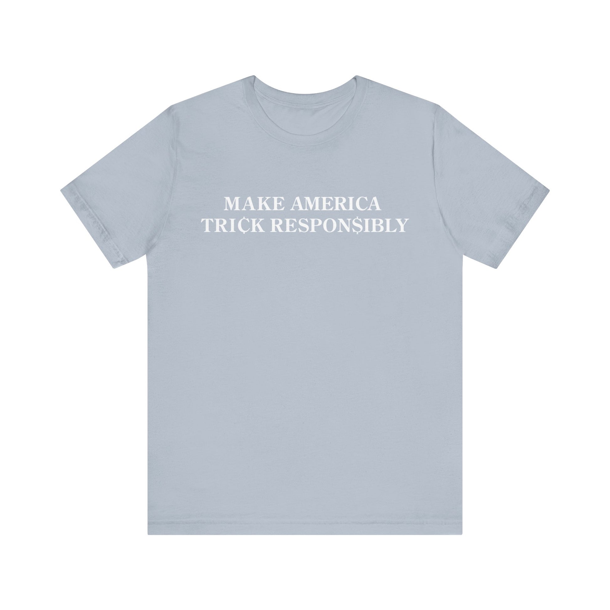 This classic "MAKE AMERICA TRICK RESPONSIBLY" unisex jersey short sleeve tee fits like a well-loved favorite. Soft cotton and quality print make users fall in love with it over and over again. These t-shirts have-ribbed knit collars to bolster shaping. The shoulders are tapered for a better fit over time. Dual side seams hold the garment's shape for longer.